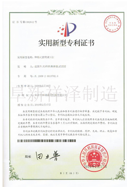 伸縮式套筒液壓缸專(zhuān)利證書(shū)